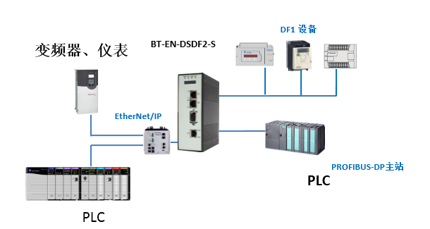 网关提供一个 EtherNet/IP以太网端口,2个DF1串行端口,以及一个Profibus-DP端口分别和PLC或者其他以太网设备(HMI、变频器、操作员站等),DF1设备,以及Profibus-DP主站进行通信。