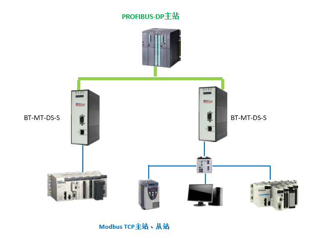 网关提供一个Modbus TCP以太网端口以及一个Profibus-DP端口分别和PLC或者其他以太网设备(HMI、变频器、操作员站等)以及Profibus-DP主站进行通信。